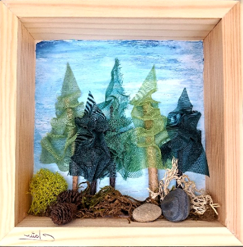 Supples & materials provided include: 1 wood shadow box, organza fabrics, acrylic paint, moss, stones, wood, lichens.